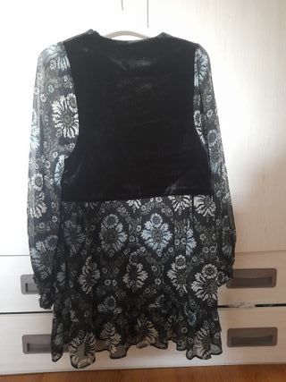 Precioso vestido de Zara en talla XS (equivalente a la 34 o 6). Es una prenda elegante y vistosa. - Diseño combinado: terciopelo negro y estampado floral en verde y negro. - Manga larga. - Falda con vuelo.