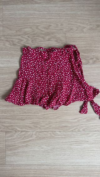 Preciosa falda roja con estampado de flores blancas. Es una falda corta, ideal para el verano. - Diseño de vuelo. - Cierre con lazo a la cintura. - Tejido ligero y fresco.