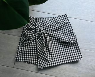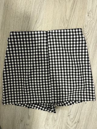 Falda pantalón de Zara con un diseño de cuadros blancos y negros. Presenta un detalle de lazada en la parte delantera. - Estampado de cuadros. - Lazada frontal. un arreglo en parte trasera tal cual foto