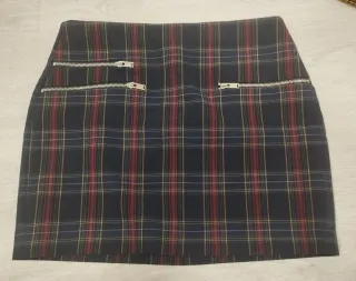 Minifalda de cuadros con cremalleras decorativas de Zara - Diseño de cuadros escoceses. - Detalle de cremalleras plateadas en la parte delantera.