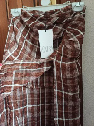 Falda pantalón de Zara con un estampado de cuadros sutil. - Cintura elástica fruncida. - Diseño con vuelo. - Tejido ligero. - Pantalón debajo, comodísima. - Estado, impecable. - Talla S, pero vale para M. - No es mini.