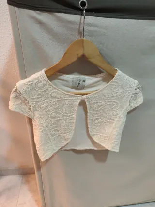 Elegante chaquetilla de encaje con un diseño drapeado, ideal para complementar atuendos de fiesta o eventos especiales. Combina a la perfección con la falda de Zara del mismo perfil. - Diseño de encaje intrincado. - Manga corta. - Corte abierto frontal.