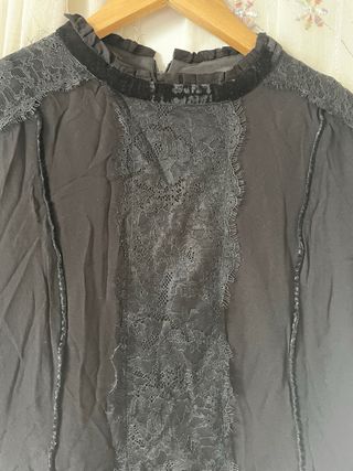 Camiseta de Zara con un diseño único de encaje y detalles en polipiel. - Cuello alto. - Manga larga. - Cierre de cremallera en la espalda. - Adornos geométricos. falda a juego en mi perfil. precio negociable.