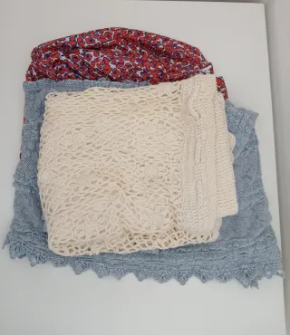 Conjunto de tres faldas cortas. - Falda con estampado floral rojo y azul. - Falda de crochet en color crema. - Falda de encaje en color azul claro.
