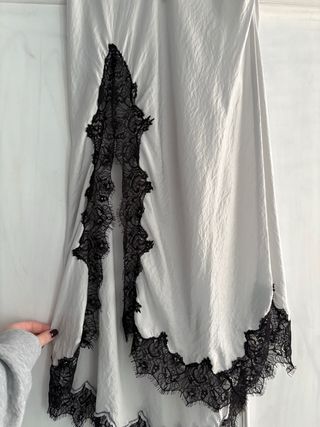 Vestido lencero de tirantes finos con detalles de encaje. - Diseño elegante con mezcla de texturas. - Acabado satinado en la falda. - Adorno de encaje en el bajo.
