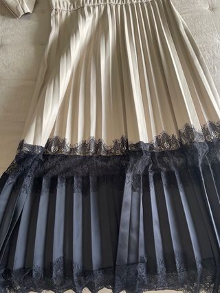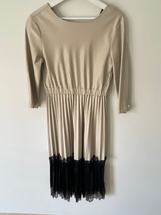 Elegante vestido de Zara con un diseño moderno y sofisticado. - Cuerpo de manga larga en color beige. - Falda plisada con detalle de encaje negro en el bajo. - Cintura elástica para un ajuste cómodo.