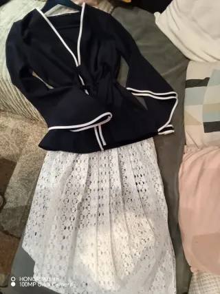 Elegante conjunto de dos piezas. - Blusa azul con detalles blancos. - Falda blanca con encaje. Lleva pequeño forro en el interior.