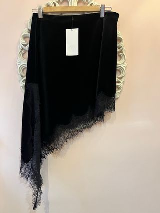 Falda corta de tiro medio confeccionada en tejido de terciopelo. Bajo asimétrico con aplicación de encaje a tono. Cierre lateral con cremallera oculta en costura. NEGRO | 9976/185/800 Hago descuento si coges mas cosas se mi perfil.