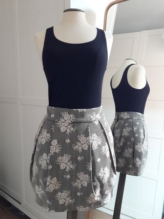 falda de raso color burdeos con flores azules. llega a la altura de la rodilla aprox. en la parte de abajo tiene una tira de encaje negro. talla S