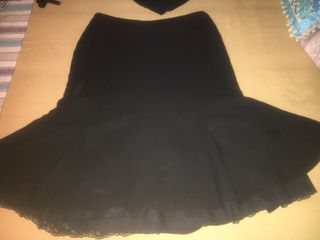 Falda negra de punto con brillo y bajo con encaje. Tiene un 5% de spandex, por lo que cede y resulta muy cómoda al sentarse y no se deforma. Tiene la cintura con goma por lo que se adapta muy bien. Es de hace unos años y tiene una calidad extraordinaria, de esas piezas que hacía Zara hace tiempo. Está puesta en pocas ocasiones. Está forrada por lo que queda más suelta. La blusa de la foto también la tengo en el perfil por si interesa el conjunto completo. El resto es atrezzo
