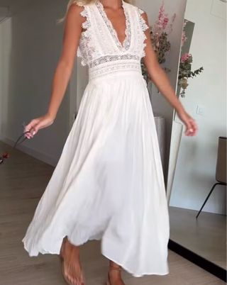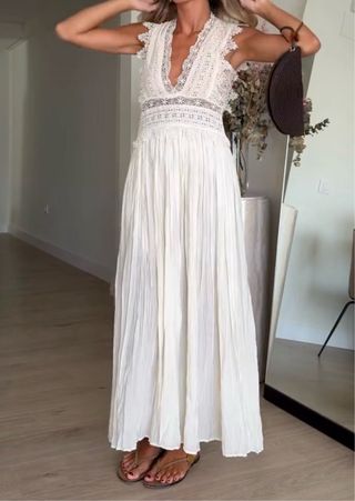 Precioso vestido largo blanco de Zara, ideal para eventos especiales. Es de un tejido ligero y fluido, con un diseño elegante y sofisticado. - Escote en pico - Detalle de encaje en el pecho y la cintura - Falda fluida - muy buscado - agotado en web