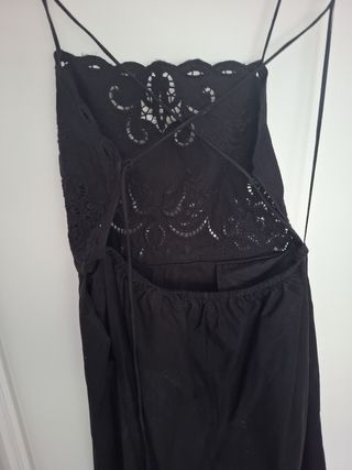 Elegante vestido negro de Zara con un diseño de espalda descubierta. - Detalle de encaje en el corpiño. - Aberturas decorativas en la falda. - Tirantes finos.