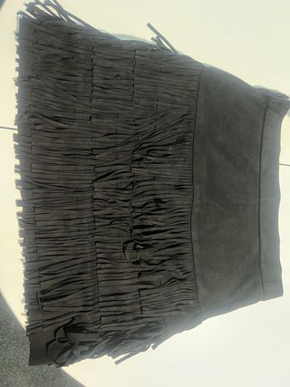 Falda de ante con un diseño de flecos en varias capas. El material es suave y flexible, aportando movimiento a la prenda. - Diseño de flecos en cascada. - Material de ante. - Color marrón.