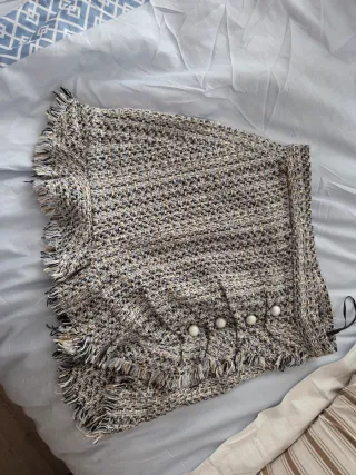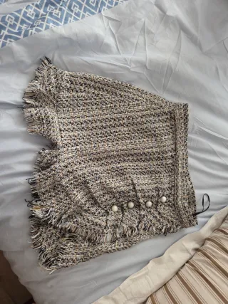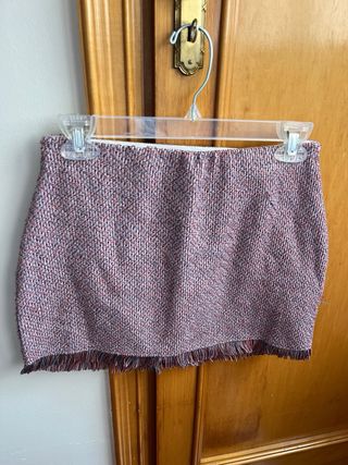 Falda corta de Zara con un diseño tejido y detalles vibrantes. - Tejido tipo tweed con hilos de colores. - Adornos de flecos y detalles geométricos en los laterales. - Borde inferior con abalorios y acabado de crochet.
