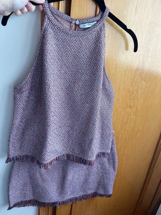 Conjunto de dos piezas de Zara, ideal para un look moderno. - Top de tirantes con cuello halter. - Falda a juego con detalle de flecos. - Tejido texturizado con hilos de colores. Me mudo y necesito desprenderme de ropa y objetos, mira mi perfil por si te puede interesar algo más 😉