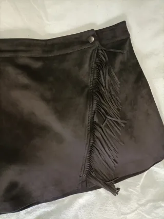 Falda corta con un diseño asimétrico y detalle de flecos. - Material tipo ante. - Cierre de botón y cremallera - Estilo boho.