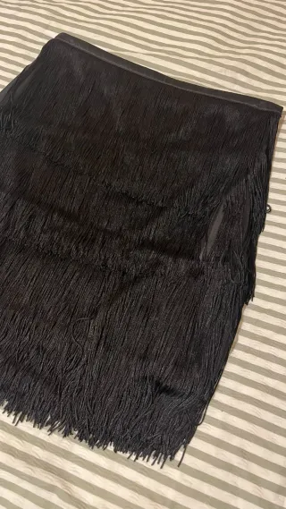 Falda negra con detalle de flecos largos en el bajo. Diseño moderno y llamativo. - Flecos largos y fluidos. - Corte asimétrico, más corta en la delantera y más larga en la parte trasera.
