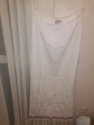 Falda larga de lino con un diseño original y llamativo. La falda presenta una parte con tejido de red y flecos largos que le dan un toque bohemio y elegante. - Tejido de lino. - Detalle de red y flecos. El bajo lo tiene descosido pero esta en perfecto estado