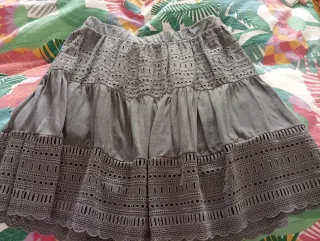 Falda gris con un diseño de volantes y detalles bordados. - Tejido ligero. - Cintura elástica. - Bordados decorativos en varias capas. - Bajo con puntilla.