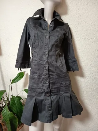 Vestido corto de tela con botones. Es un diseño muy favorecedor - Diseño con cuello camisero. - Mangas tres cuartos. - Falda con pliegues. - Cremalleras decorativas en los laterales.