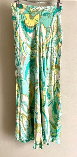 Falda midi de tela fluida y satinada con caída, de original estampado en tonos verde, rosa y amarillo. De Zara. Talla S. Medidas en las fotos. Se lava perfectamente en lavadora. Usada en algunas ocasiones, pero en perfecto estado. La puedes combinar con una americana rosa (última foto) q encontrarás en mi “armario”.