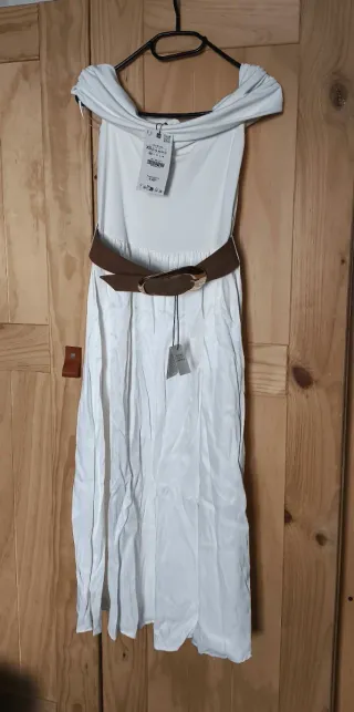 Vestido midi de Zara con escote Bardot y cinturón. - Diseño elegante off shoulder. - Cinturón marrón a juego. - Falda larga con caída.