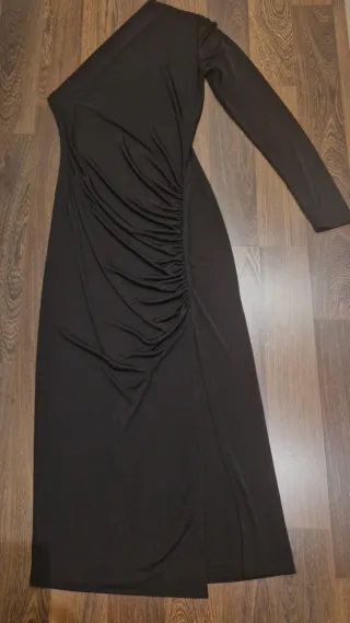 Elegante Vestido midi negro de Zara. Talla S. Diseño asimétrico: manga larga con hombro y brazo derechos al descubierto. Detalle drapeado lateral izquierdo que parte desde la cintura hasta media pierna (donde empieza la abertura de la falda). Sin forro. Tejido suave, ligero pero, a la vez, con caída. Está perfecto.