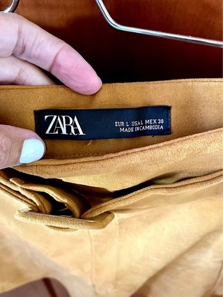 Falda corta de ante en color mostaza de Zara. Es muy bonita. - Cierre con botones metálicos. - Trabillas para cinturón. - Incluye cinturón.