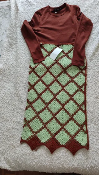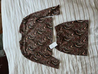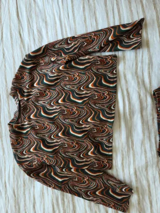 Conjunto talla S de Zara. Mismo estampado multicolor (naranja, marrón, verde oscuro, beige). Tejido súper gustoso. Falda corta de tiro alto elástica, sin estrenar. Jersey/chaqueta manga larga, usada solo una vez.