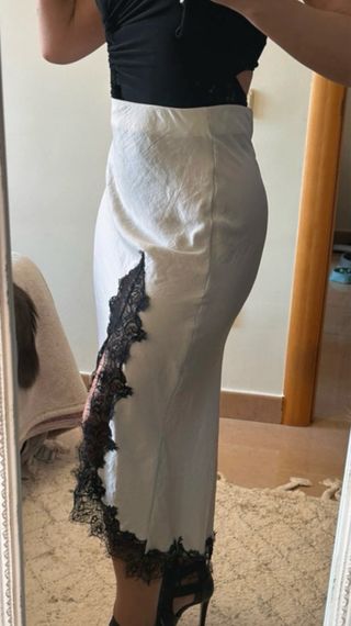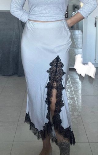 Falda de estilo lencero con un detalle de puntilla en contraste. - Diseño elegante con puntilla negra, satinado en gris muy claro. - Corte favorecedor.