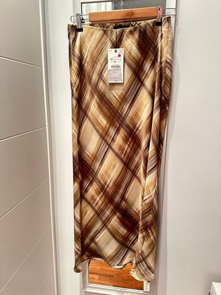 Falda midi satinada con estampado de cuadros. - Diseño fluido y elegante. - Largo midi. - Estampado de cuadros en tonos marrones y beige.