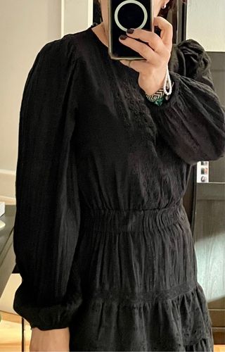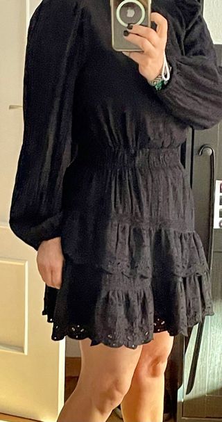 Vestido negro de Zara con estampado floral, diseño de manga corta y corte en A que favorece la silueta. Presenta falda plisada que aporta movimiento y un acabado elegante. Está confeccionado en mezcla de viscosa, algodón y elastano, con tejido de grosor medio (no tan fino), lo que le da buena caída y estructura. Medidas orientativas: - Talla S (EUR/UK) - Pecho: 44cm - Cintura: 38cm - Largo: 84cm Si tienes dudas, ¡no dudes en escribirme! Estoy encantada de ayudarte. 😊