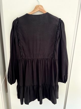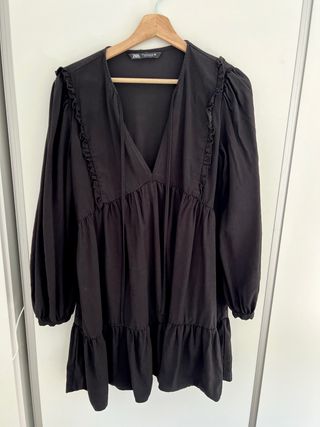 Vestido corto de Zara con manga larga y detalles de volantes. - Escote en pico con cordones. - Volantes en los hombros y a lo largo del escote. - Doble capa en la falda con volantes.
