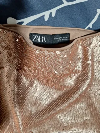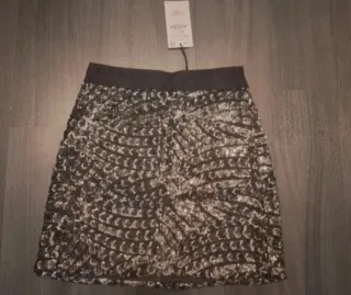 Falda corta de Zara con un diseño de lentejuelas. - Lentejuelas circulares en tonos beige y dorado. - Talla S (Sirve para talla M) - Largo mini.