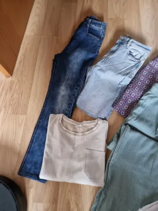 Conjunto de varias prendas de ropa para mujer. - Pantalones vaqueros azules pitillo - Pantalones vaqueros croped flare blanco talla 13/14 de Zara (talla como una S) - Pantalones vaquero corto - Camiseta beige de manga larga talla 11/12 de Zara (como una xs/s) - Pantalón largo verde de canalé. - Mini falda estampada de stradivarius 34 #fondodearmario #basicos #basicoschica