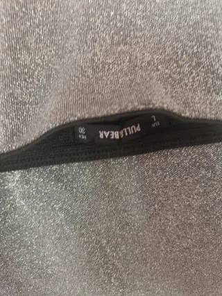 Top brillante con lentejuelas plateadas, ideal para eventos o salidas nocturnas. Diseño con tirantes finos y escote drapeado. Top brillante negro Falda - Acabado metalizado. - Tejido ligero y fluido.