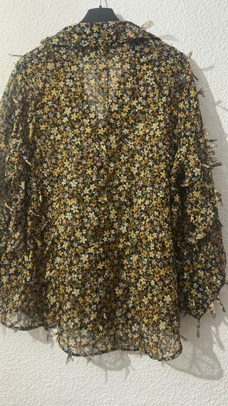 Blusa de Zara, talla S, con estampado floral en tonos mostaza, blanco y verde sobre fondo oscuro. ✨ Tejido ligero y semitransparente ✨ Detalle de textura con pequeñas aplicaciones deshilachadas que le dan relieve ✨ Manga larga ✨ Cuello camisero ✨ Muy favorecedora y con movimiento Ideal para entretiempo o para combinar con jeans, pantalón negro o falda. Tiene un aire romántico y vintage muy bonito.