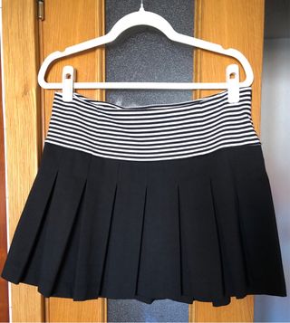 Preciosa falda plisada de Zara Basic, talla L. Es una falda elegante y versátil, ideal para cualquier ocasión. - Tiene una bonita combinación de colores blanco y negro. - La parte superior de la falda tiene rayas horizontales.