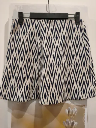 Mini falda con un llamativo estampado geométrico. - Diseño de rombos en azul marino y blanco. - Corte acampanado. - Tejido con textura. Talla m, una puesta, como nueva