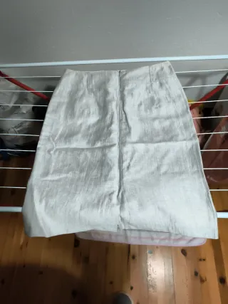 Impecable falda de Zara con un acabado champagne y plateado. Con bonita caida, estiliza mucho, Muy versátil, se puede llevar también como top. Figura como M pero sirve también para una S. Puesta en dos ocasiones. Sugiere lavado a mano pero se puede utilizar un lavado delicado en lavadora sin problema