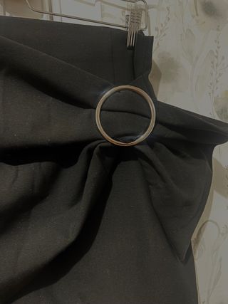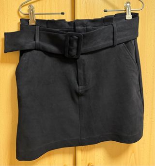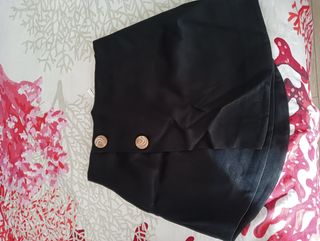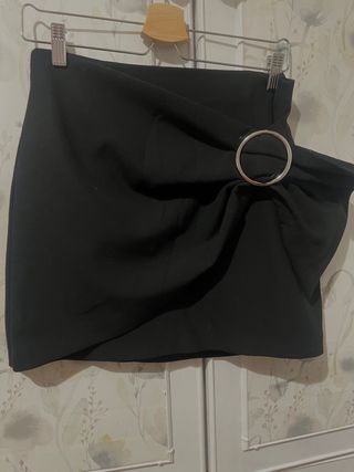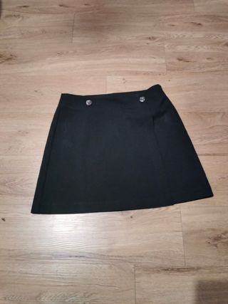 Falda negra corta , tejido de invierno. Tiene un recogido lateral con hebilla grande en plateada