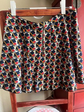 Falda corta evasé estampada con cremallera dorada en la parte trasera