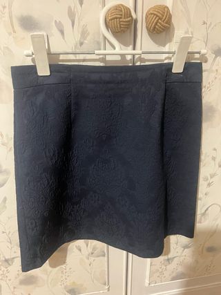 Preciosa falda corta de color azul marino oscuro. Tiene un estampado floral en relieve que le da un toque elegante. Es una prenda en buen estado, lista para usar. - Diseño elegante y sofisticado. - Estampado floral en relieve. - Corte a la altura de la rodilla.