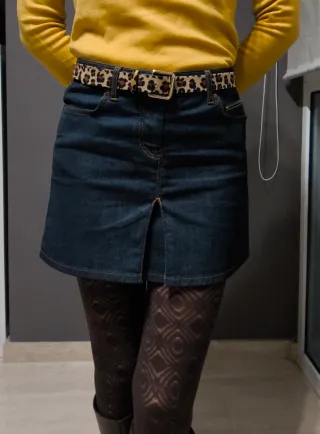 Falda vaquera corta de Zara. - Diseño de mezclilla. - Detalle de abertura frontal.