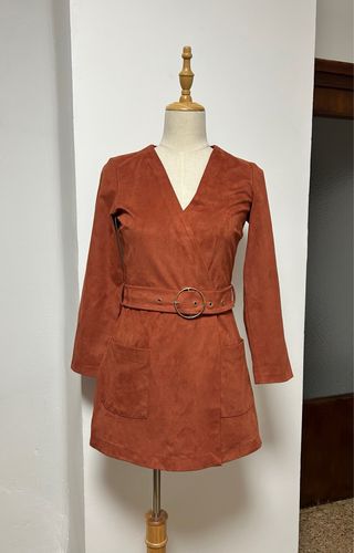 Vestido falda-pantalón de antelina con pinzas de la firma española Zara color caldera. Cuello en V. La falda cruza en la parte frontal. Abrocha mediante cremallera lateral invisible y la falda (tipo pañal) abrocha con un corchete muy discreto. También lleva cinturón con hebilla redonda metálica color dorado. Talla M. Nuevo sin estrenar. Vestido/Mono con pinzas en el pecho (pinza de busto) y en el pantalón por la parte trasera (pinza de entalle trasera). Las costuras tal y como se puede ver están perfectas. Tejido con mucho cuerpo.