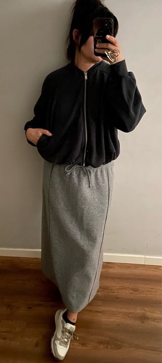 Falda larga de Zara en color gris. Diseño moderno y cómodo. - Talla L - Cintura con cordón ajustable. - Costuras decorativas. - Largo hasta el tobillo.