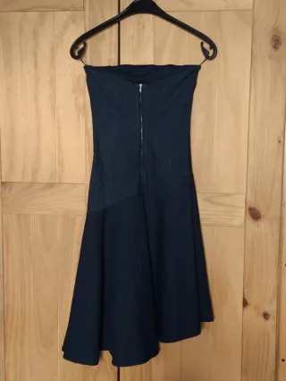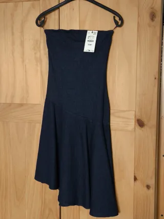 Vestido midi de Zara en tejido denim de color azul oscuro. Diseño sin tirantes y con corte asimétrico en la falda. - Talla S / 36 / 8. - También en talla XS y M - Etiqueta original incluida.
