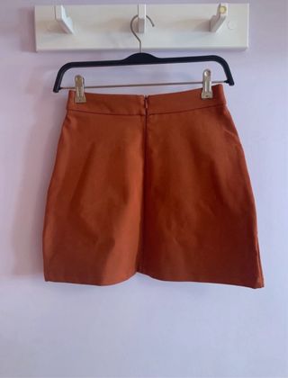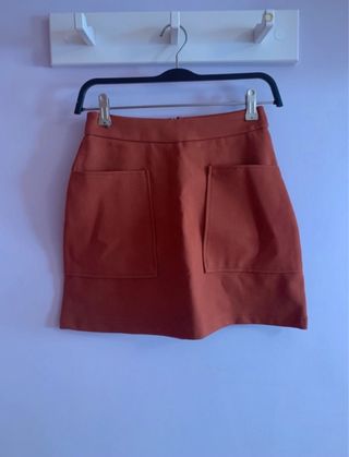 Falda corta de Zara en un bonito color teja. Tiene un diseño moderno con bolsillos. - Dos bolsillos frontales. - Cremallera en la parte trasera.