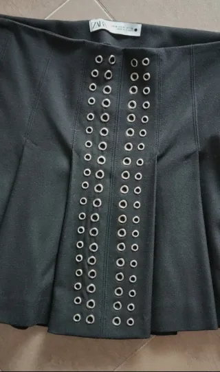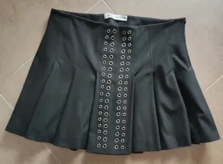 Falda corta de Zara con un diseño moderno. - Detalle de ojales metálicos en la parte frontal. - Corte acampanado con pliegues. - Cremallera lateral para cierre.