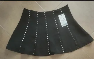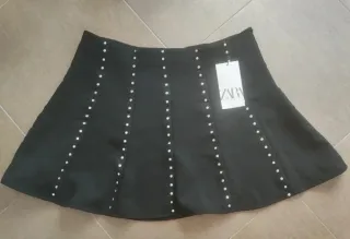 Falda corta de Zara con tachas decorativas. - Diseño con tachas plateadas. - Corte acampanado.